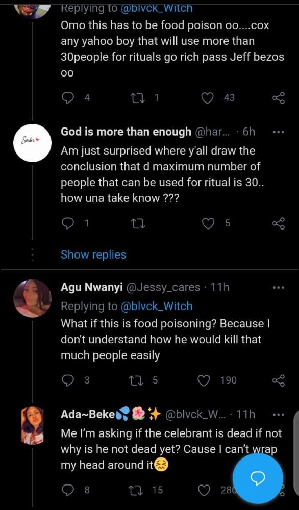 With the public outrage wanting to know the reason behind this ugly incident, most persons are redirecting the cause for the massive deaths to be food poisoning and not anything concerning yahoo rituals.