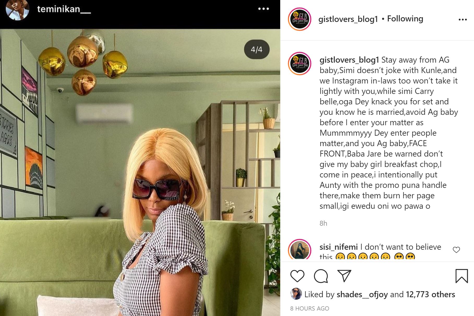 “Stay away from AG baby,Simi doesn’t joke with Kunle,and we Instagram in-laws too won’t take it lightly with you,while simi Carry belle,oga Dey knack you for set and you know he is married,avoid Ag baby before I enter your matter as Mummmmyyy Dey enter people matter,and you Ag baby,FACE FRONT,Baba Jare be warned don’t give my baby girl breakfast chop,I come in peace,i intentionally put Aunty with the promo puna handle there,make them burn her page small,igi ewedu oni wo pawa o”